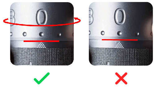 ![]() | Sulygiuokite #0 su skalės žyme ir apačia reguliavimo ratuko žiedo kraštas liečiasi pirmoji skalės žymės pakopa. |