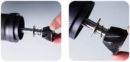 - Įdėkite kavos pupeles į piltuvą ir pasukite rankenėlę pagal laikrodžio rodyklę, kad pradėtumėte malti.