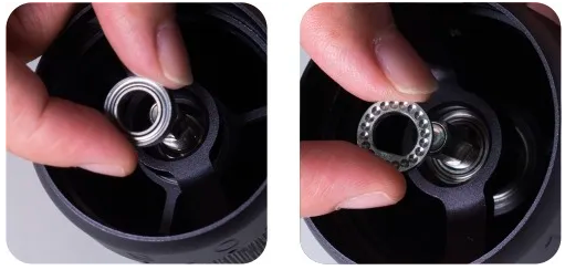 ![]() | Viršutinį guolį įdėkite atgal iš viršaus. Spausdami girnelę iš apačios, uždėkite viršutinį guolio dangtelį atgal. Šoninė pusė su įgaubti taškai nukreipti į viršų, o U formos skylė tinkamai tinka velenui. |