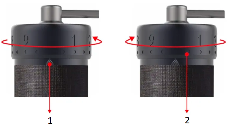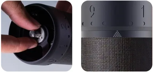 - Malūnėlis paruoštas naudoti išpakavus. Pasukite reguliavimo ratuko žiedą prieš laikrodžio rodyklę iki pradinio taško, kur prasideda pasipriešinimas ir alkūninė rankena negali laisvai suktis. Nr. 0 bus sulygiuotas su skalės žyme, o apatinis reguliavimo ratuko žiedo kraštas lies pirmąją skalės žymės pakopą.
