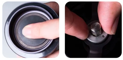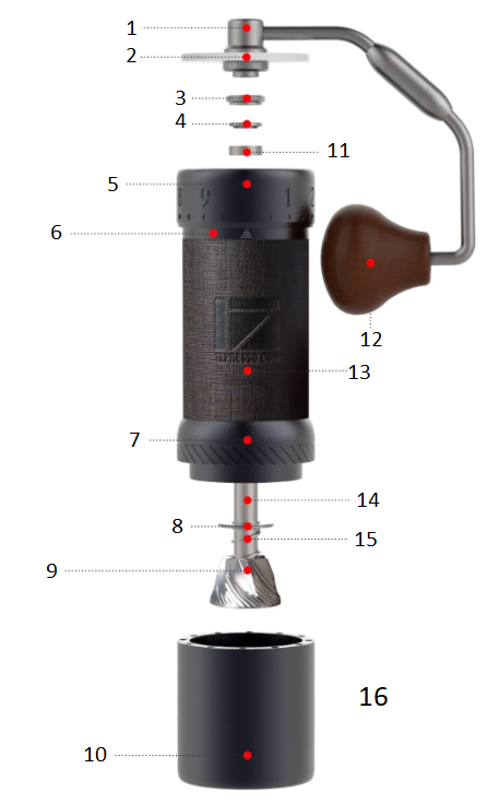 ![]() | Priveržkite rievėtą nykščio formos veržlę, kad kalibruotumėte malūnėlį, spausdami girnelę iš apačios. Pastaba: Iš viso yra keturi su puse rotacijos skaičiuojant nuo pradinio taško. Pradinis taškas gali gali skirtis ±10 paspaudimų tikslumu dėl priveržimo stiprumo veržlė ir ratukas. |