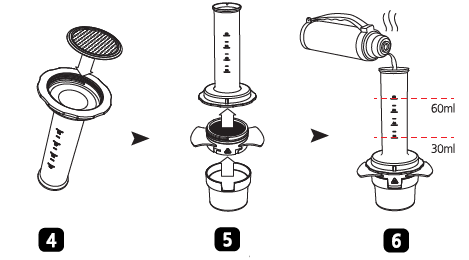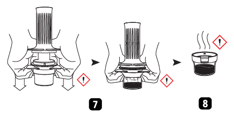 - Įstatykite stūmoklį į kamerą, palaukite 5–10 sekundžių, kol bus atliktas išankstinis užpylimas, tada abiem rankomis vienu metu paspauskite ir suspauskite stūmoklio ir filtro krepšelio rankenas. (9 barų slėgis pasiekiamas, kai spaudimo galia siekia 55 kgf). Būkite atsargūs, nes ruošiant espreso kavą iš oro angos gali išeiti karšti garai.