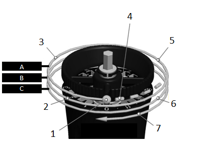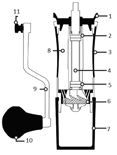 Šlifuoklis susideda iš trijų pagrindinių dalių: (A) nuimamos aliuminio rankenos, (B)