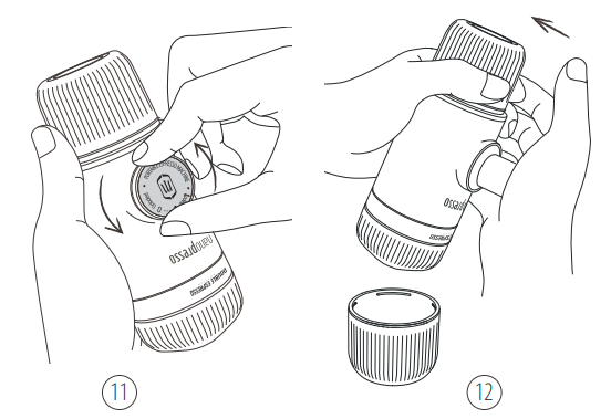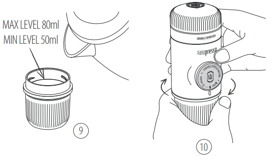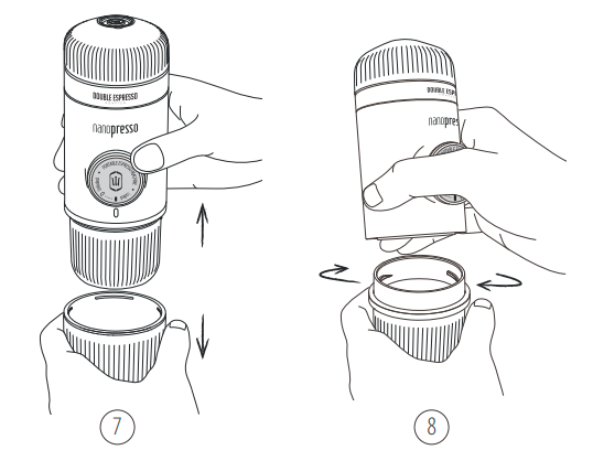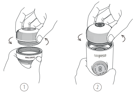 11. Atblokuokite stūmoklį iš jo eigos padėties. 12. Laikykite NanoPresso dviem rankomis, kaip parodyta. Pradėkite pumpuoti virš puodelio. Lėtai pumpuokite, kol išbėgs visa kava. | ![]() |