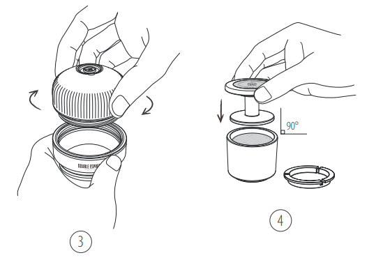 3. Įsukite Portafilter į dvigubą espreso adapterio žiedą. 4. Į filtro krepšelį suberkite kavos tirščius (16 g). Espreso maltai kavai išlyginti ir suspausti naudokite Tamper. | ![]() |
