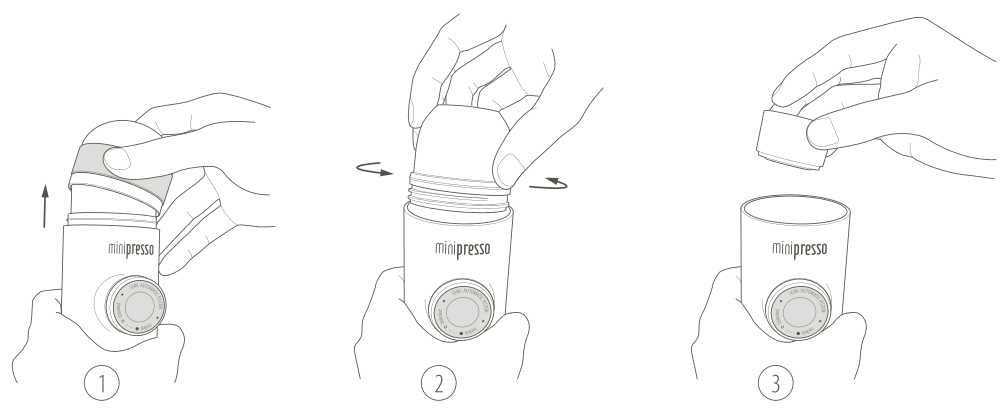 - Niekada negerkite skysčio tiesiai iš MiniPresso, nes turinys gali būti karštas.