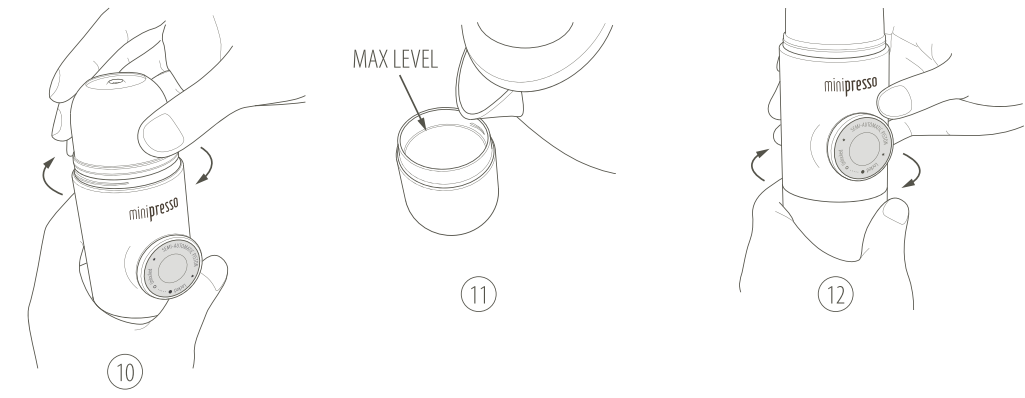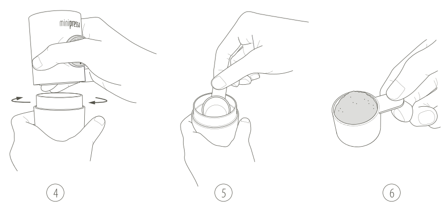 14. Uždėkite MiniPresso antgalį virš puodelio ir pradėkite pumpuoti. Pirmieji 6 paspaudimai pripildys filtro krepšelį vandens. Pumpuokite tol, kol nebebėgs kava.