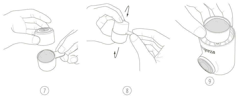 8. Atbulai pasukite, kad visi milteliai būtų perpilti į filtro krepšelį.