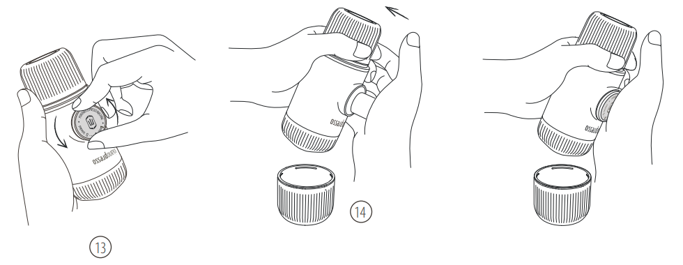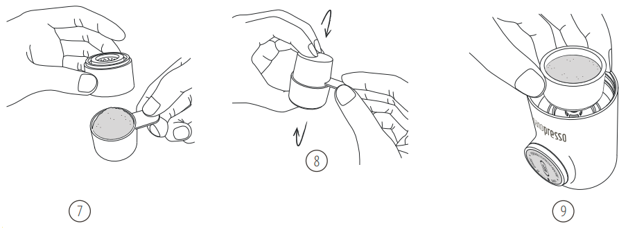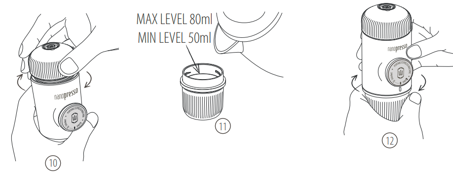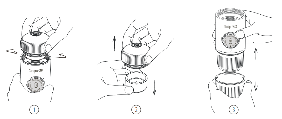14. Laikykite NanoPresso dviem rankomis, kaip parodyta aukščiau. Pradėkite pumpuoti virš puodelio. Pirmųjų 8 paspaudimų metu susidaro slėgis. Lėtai pumpuokite, kol išbėgs visa kava.